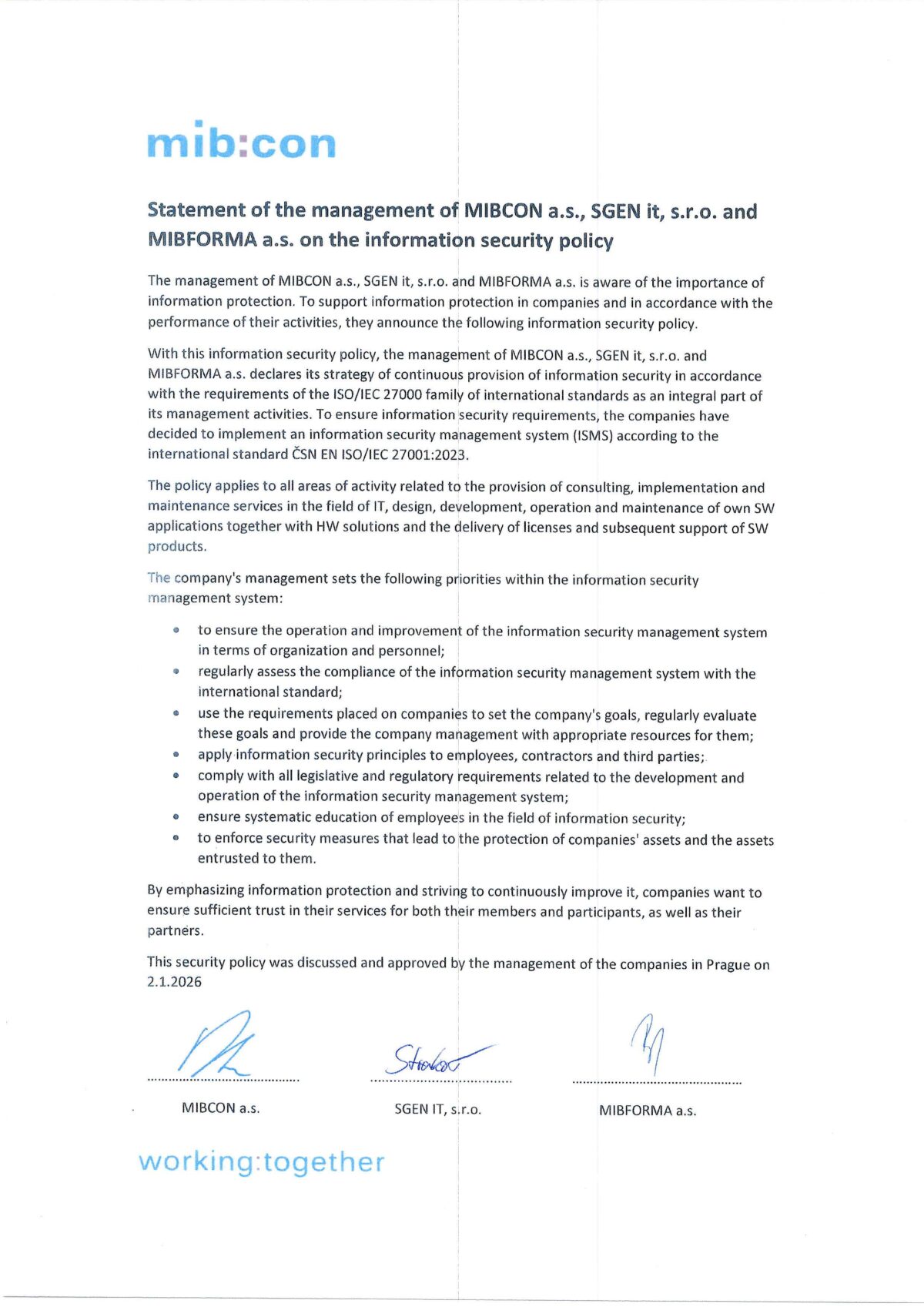 Information Security Policy Statement of MIBCON a.s., SGEN IT, s.r.o., and MIBFORMA a.s.