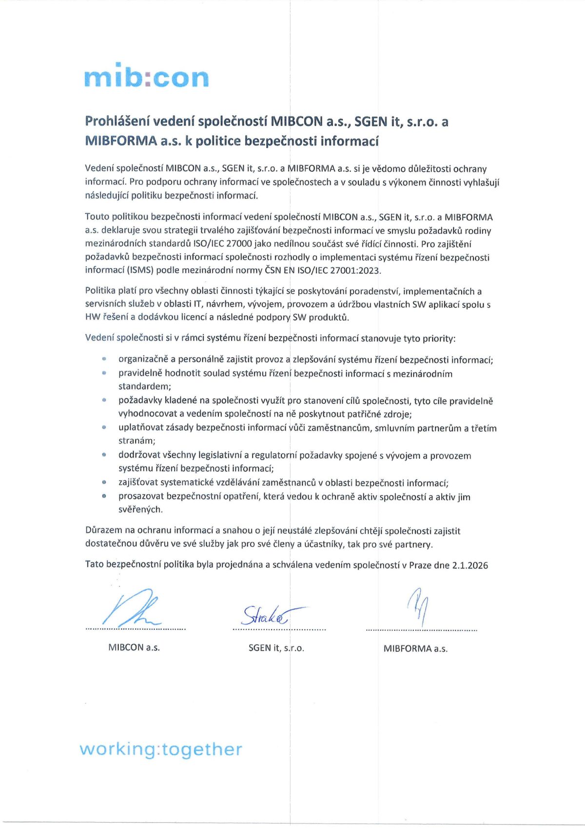 Prohlášení společností MIBCON a.s., SGEN it, s.r.o. a MIBFORMA a.s. k politice bezpečnosti informací.
